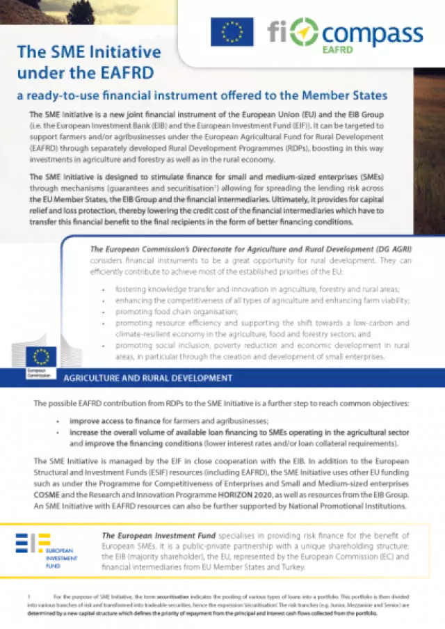 The SME Initiative is a joint financial instrument of the European Union and the European Investment Bank Group, designed to stimulate finance for small and medium-sized enterprises in the Member States. It can be targeted to support farmers and/or agribusinesses under the European Agricultural Fund for Rural Development, boosting in this way investments in agriculture and forestry as well as in the rural economy.